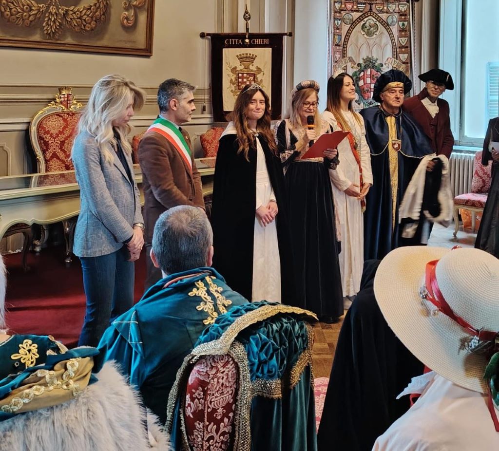 Questa mattina, sabato 24 gennaio si apre alle 10.30 nella Sala del Consiglio Comunale con la tradizionale investitura dei personaggi del Carnevale chierese. A vestire i panni della Bela Tëssiòira è Michela Ronco, insegnante di scienze motorie ed educazione sportiva, consigliera dello Sci Club locale, concorrente all’elezione di Miss Rubatà e proveniente da una famiglia di panettieri specializzati, non a caso, nella produzione dei grissini. Il suo abito, realizzato nel solco della tradizione, è stato confezionato dall’associazione chierese Muse utilizzando la stoffa offerta dalla Tessitura Quagliotti.